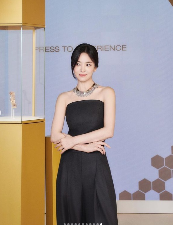 공개된 사진 속 송혜교는 한 명품 쥬얼리 브랜드 행사에 참석한 모습. 머리를 묶은 채 검은색 오프숄더 상와 와이드 팬츠를 매치한 송혜교는 화려한 목걸이를 완벽하게 소화하며 우아하면서도 고급스러운 매력을 자랑해 시선을 모은다.