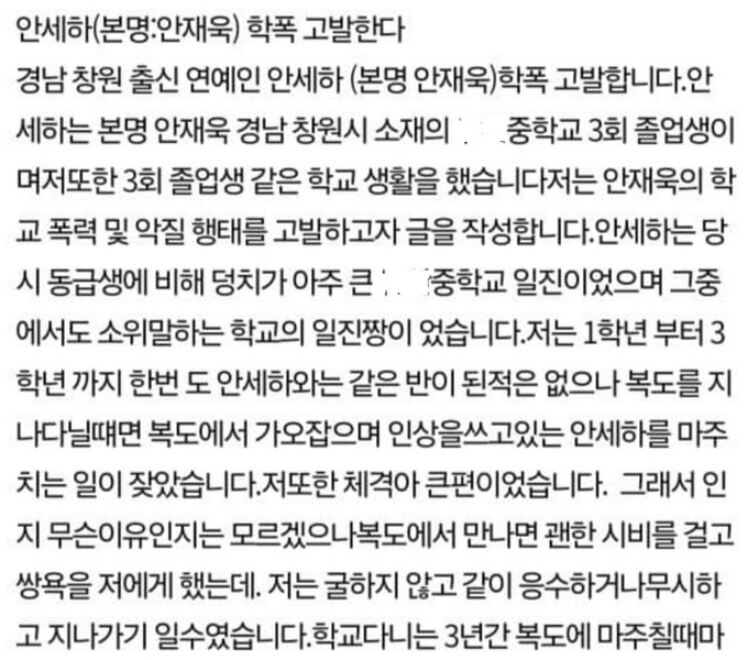 A씨는 “당시 학주 선생님과 담임 선생님이 어떤 일이 있었는지 물으셨고 해당 사실을 설명드리니 저의 성향을 잘 아시는 선생님께서는 위로하시며 돌려보내고 부모님께 연락을 드렸다. 안세하와 일진 몇 명을 불러 혼을 내신 걸로 안다”며 “이후로도 안세하는 복도를 지날 때마다 제게 욕과 시비를 걸었고 졸업까지 지속됐다”고 주장했다.