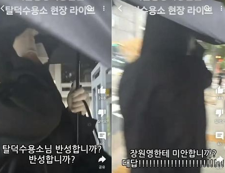 이에 탈덕수용소가 우산으로 얼굴을 가리려했고, 상남철은 우산을 붙잡으며 “장원영한테 미안해요 안 미안해요 대답”, “대답! 대답하세요”라고 소리쳤다. 법원 경위의 제지로 더이상의 촬영은 이어지지 않았다.