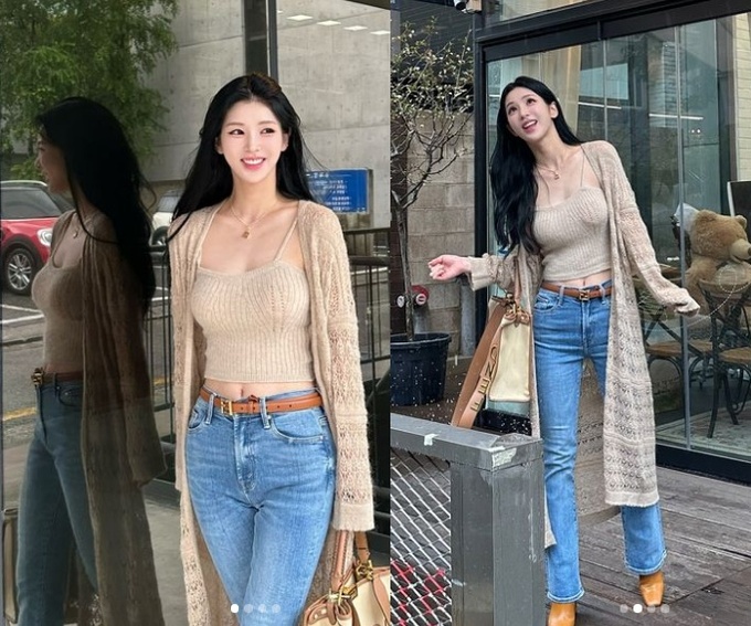 공개된 사진은 그의 일상. 크롭 상의와 청바지을 매치하며 청순하면서도 섹시한 스타일링을 선보인 강다은은 S라인 몸매를 자랑해 시선을 모은다.
