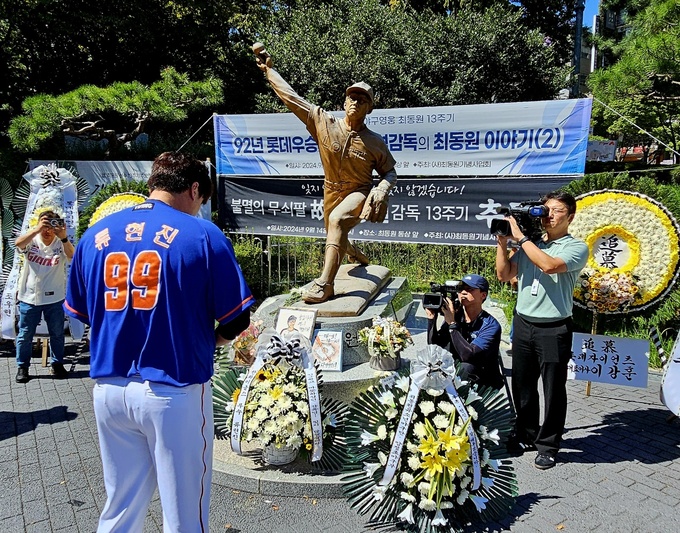 이 자리에는 ‘괴물’ 류현진(한화)도 참석해 의미를 더했다. ‘친근하고 따뜻하셨던 김독님! 잊지 않겠습니다’라는 글이 적힌 꽃을 헌화했다. 류현진이 추모 행사에 참석한 건 이번이 처음이다. 2013년부터 지난해까지 미국 메이저리그(MLB)에서 뛰는 등 기회가 잘 닿지 않았다. 마침 이날 부산 롯데전이 예정돼 있어 함께할 수 있었다.