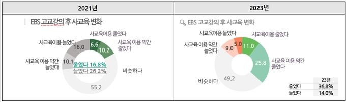 EBS는 25일 “2021년부터 2023년까지 ‘고교강의 만족도 조사 및 사교육비 경감효과 연구’ 자료를 비교했을 때 ‘고교강의 후 사교육 이용이 줄었다’는 학생 비율이 매년 증가해 16.8%(21년), 28.2%(22년), 36.8%(23년)로 21년 대비 약 120%로 크게 늘어났다”고 밝혔다. 반면, 사교육이 늘었다고 답변한 학생은 26.2%(21년), 22.2%(22년), 14%(24년)으로 21년 대비 약 46% 감소해 사교육 경감 및 성장 둔화에 효과가 있다고 해석했다.