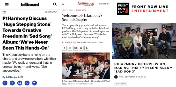 더 할리우드 리포터 역시 ‘피원하모니의 두 번째 장에 오신 것을 환영합니다(Welcome to P1Harmony’s Second Chapter)’라는 제목의 기사에서 “피원하모니의 모든 멤버가 어떤 방식으로든 ‘SAD SONG’ 제작에 기여했다”고 전하며 앨범 제작 참여도가 높은 피원하모니의 프로다운 면모에 집중했다. 이어 할리우드 리포터는 새 앨범 소개뿐만 아니라 전작 ‘때깔(Killin’ It)’ 활동과 음악방송 1위 등 지난 성과까지 짚으며 피원하모니에 대한 높은 관심을 보였고, 테오는 인터뷰에서 “저희가 함께 모이면 새로운 시너지가 생기고, 그게 공연과 노래에서 분명하게 드러난다”고 피원하모니를 표현하며 자신감 넘치는 피원하모니의 존재감을 증명했다.