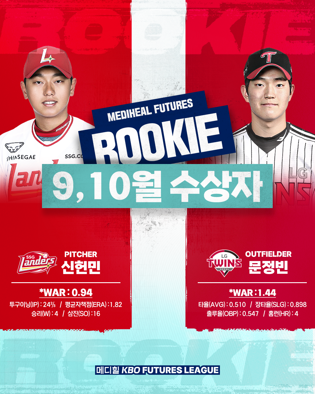 투수 부문에 선정된 신헌민은 광주동성고를 졸업하고 2022년 2차 1라운드 2순위로 SSG에 입단했다. 타자 부문 수상자인 문정빈은 서울고 출신의 육성선수로, 지난 8월 수상에 이어 2회 연속 수상의 영예를 안았다.