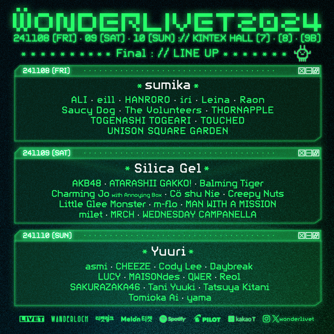 이처럼 ‘원더리벳 2024’는 sumika(스미카), Yuuri(유우리) 등 국내 리스너들의 마음을 뒤흔든 J팝 아티스트와 밴드계의 대표주자 Silica Gel(실리카겔)을 포함해 힙합, 인디, 락 등 다양한 장르를 총망라한 아티스트들이 한자리에 모이는 만큼, 다채로운 볼거리와 감동을 선사할 예정이다.