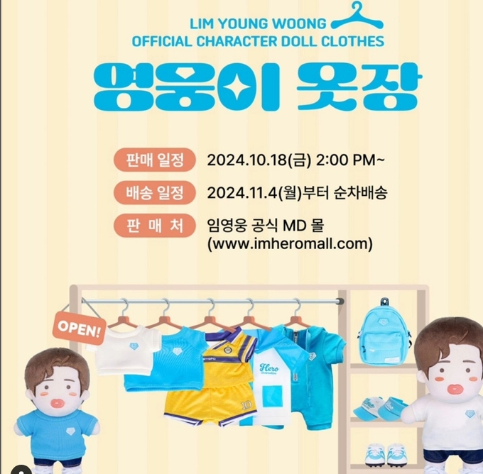 16일 임영웅 측 공식 SNS에는 “아티스트 임영웅 OFFICIAL CHARACTER ‘영웅이’ 옷장 아이템 판매 안내!”라는 글과 함께 ‘영웅이 옷장’ 판매 일정이 공개됐다. 현재 영웅이 피규어와 인형을 비롯한 다양한 공식 굿즈 등이 임영웅 공식 MD 몰 ‘아임히어로 몰’을 통해 큰 사랑을 받고 있는 가운데 깜찍한 인형 옷 판매 소식이 전해져 환호를 불러 일으켰다.