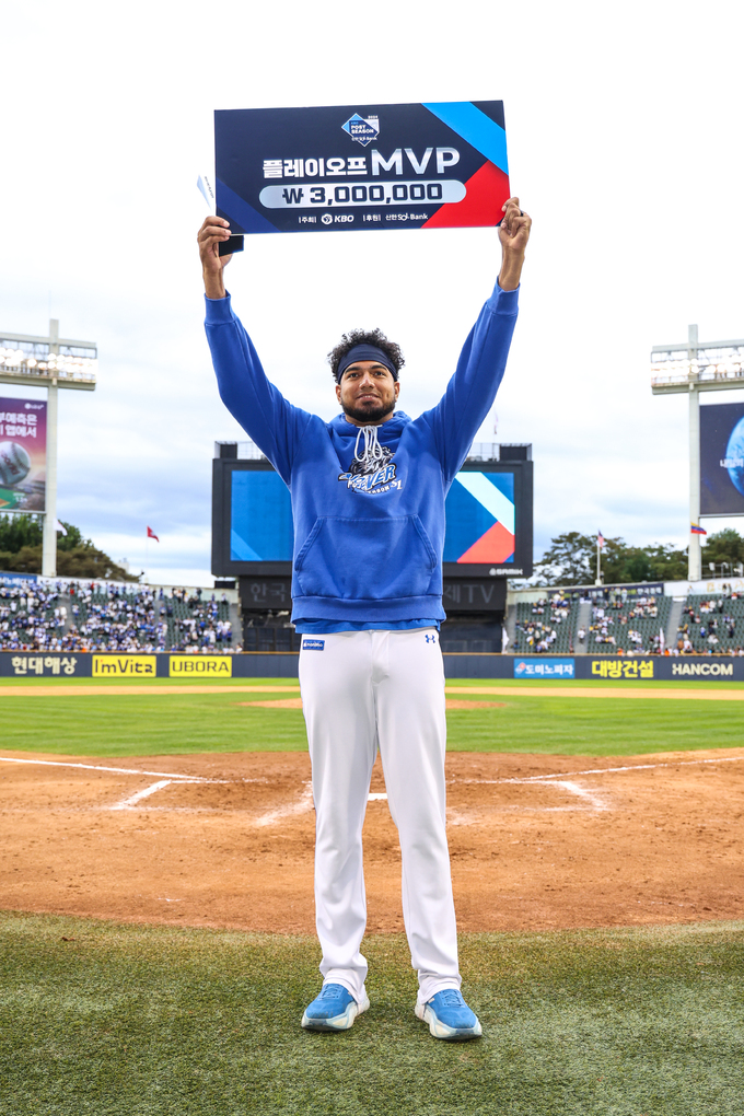 정작 레예스는 덤덤하게 제 역할을 수행했다. 가을 데뷔전인 13일 대구 1차전부터 심상치 않았다. LG 최원태와의 선발 맞대결에서 6⅔이닝 3실점(1자책) 쾌투로 곧장 선발승을 챙겼다. 대구삼성라이온즈파크에서 열린 PS에서 삼성이 거둔 첫 승리, 그 역사적인 경기의 선발승 투수로 영원히 이름을 남겼다.