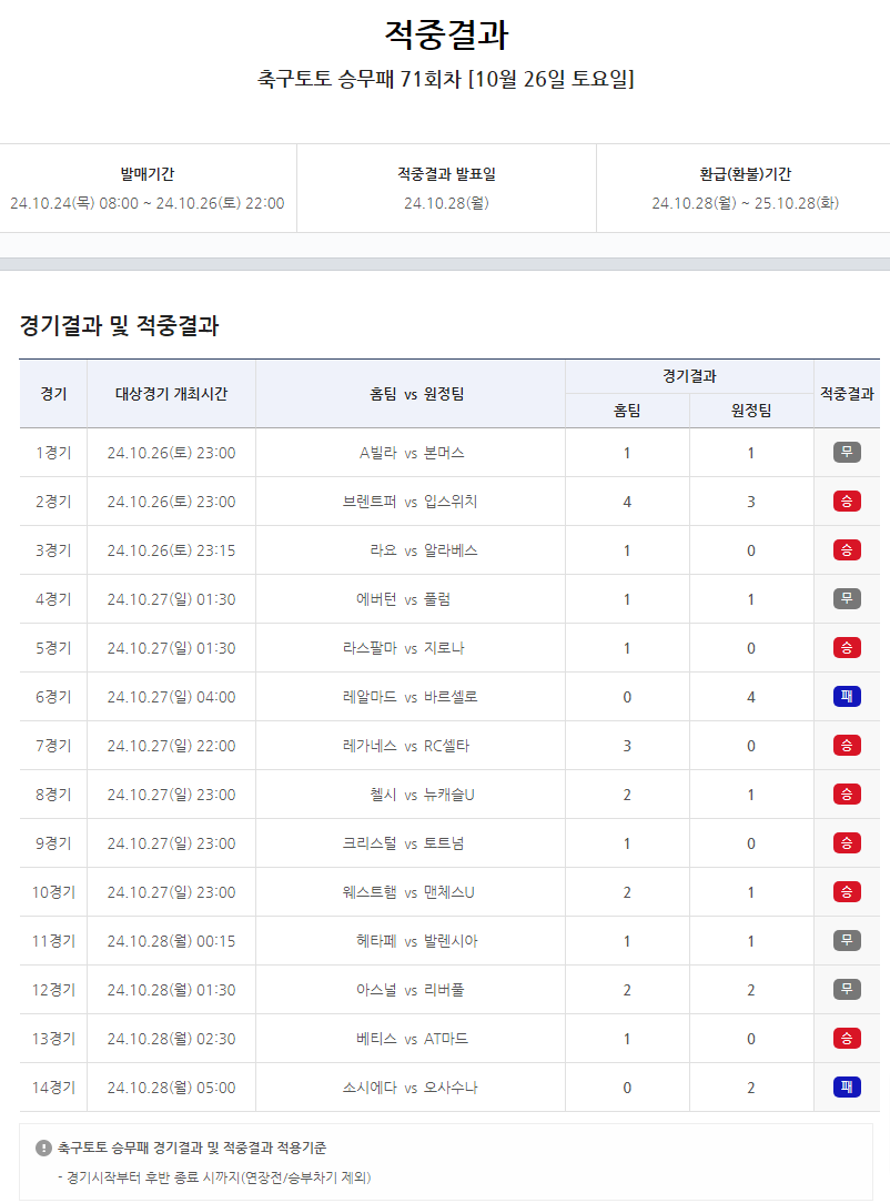 한편 축구토토 승무패 14개 대상경기 중 각 경기 결과는 승(홈팀 승리)가 8경기, 양팀의 무승부가 4경기, 패배가 2경기로 집계됐다.