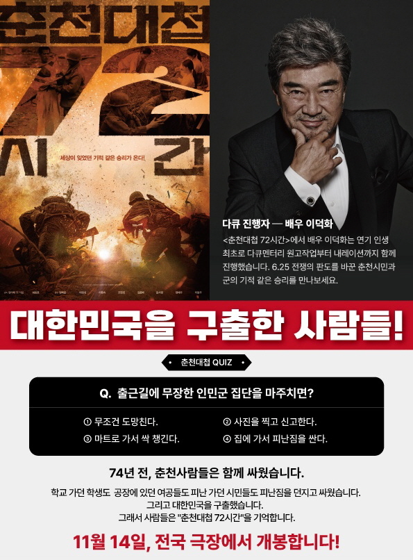 ‘춘천대첩 72시간’은 6.25 전쟁 초기 춘천에서 국군과 춘천시민들이 인민군에 맞서 72시간 동안 저항하며 최초의 승리를 거둔 역사적 전투를 다룬 작품이다. 영화는 당시의 긴박한 순간과 시민들의 헌신적인 참여를 재조명하며, 전쟁 속에서의 희생과 용기의 의미를 관객에게 전하고자 한다.