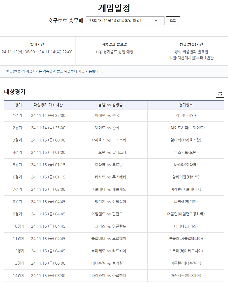 국민체육진흥공단이 발행하는 체육진흥투표권 스포츠토토의 수탁사업자 스포츠토토코리아가 오는 14, 15일 진행되는 2026 북중미 월드컵 아시아지역 예선 및 2024∼2025 UEFA 네이션스리그 경기 등 총 14경기를 대상으로 한 축구토토 승무패 76회차가 마감을 앞두고 있다고 밝혔다.