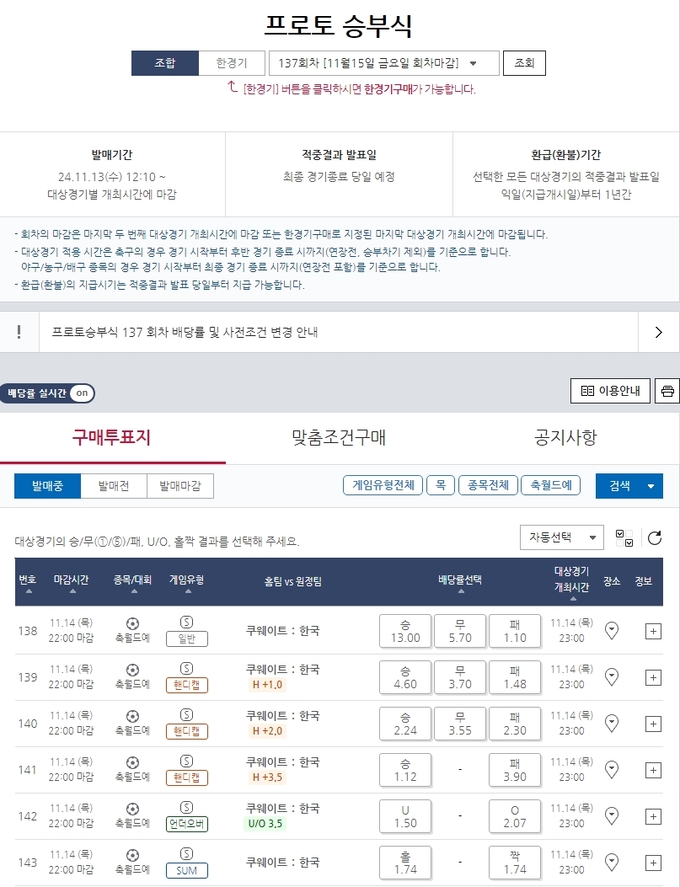 국민체육진흥공단이 발행하는 체육진흥투표권 스포츠토토의 수탁사업자 스포츠토토코리아가 오는 14일 오후 11시에 쿠웨이트시티에서 진행되는 2026 북중미 월드컵 아시아지역 예선 B조 5차전인 대한민국(원정)-쿠웨이트(홈)전을 대상으로 한 프로토 승부식 137회차 게임이 발매 마감을 앞두고 있다고 밝혔다.