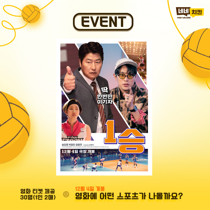네네치킨은 영화 ‘1승’을 제작지원했으며 티켓 제공 이벤트를 통해 인스타그램에서 총 30명(1인 2매), X와 스레드에서 각 10명(1인 2매)에게 제공한다.