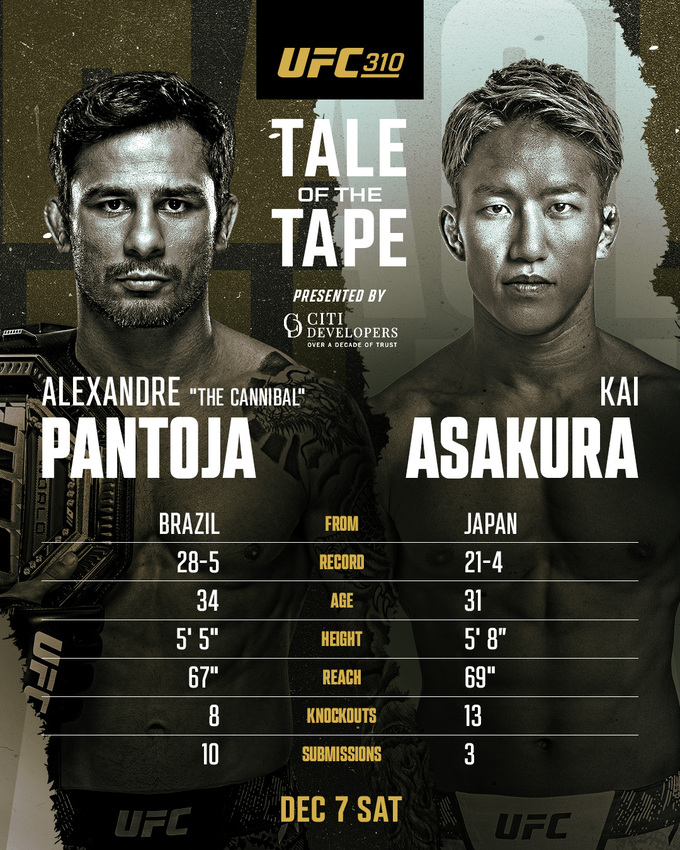 세계 최고의 종합격투기(MMA) 단체 UFC 소속 선수 아사쿠라 카이(일본)가 챔피언 벨트를 노린다. 8일(한국 시간) 미국 네바다주 라스베이거스 티모바일 아레나에서 열리는 ‘UFC 310: 판토자 vs 아사쿠라’ 메인카드서 플라이급(56.7㎏) 챔피언 알레샨드리 판토자(브라질)에게 도전한다.