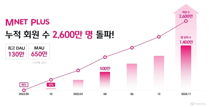 6일, CJ ENM은 ‘엠넷플러스’가 론칭 후 2년새 누적 회원수 2천 600만 명을 돌파했다고 밝혔다. 11월 월간 활성사용자 수(MAU, Monthly Active User)도 650만 명을 넘겼다. 평균 일간 활성화 이용자 수(DAU, Daily Active User) 역시 최고 130만을 웃돌며 전년 대비 200% 상승, K-POP 팬덤들이 데일리로 찾는 플랫폼으로 확실히 자리매김했다.