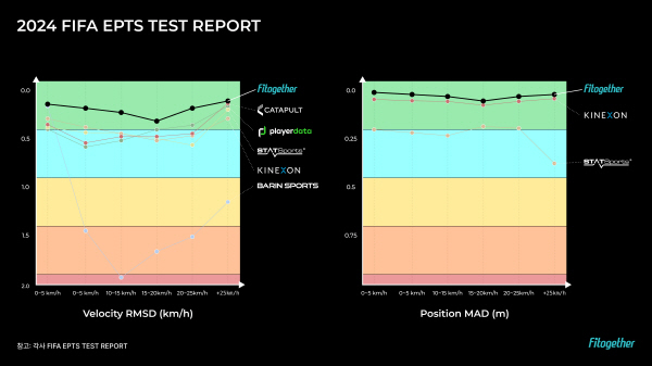 핏투게더는 이번 평가에서 FIFA 퀄리티 마크를 획득한 웨어러블 EPTS 6개 기업 중 한 곳이었다. 특히 범위별 각각 평가에서 속도와 위치 모두 ‘Well-above’가 나오면서 가장 우수한 평가를 받았다.