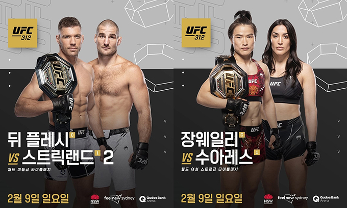 UFC는 내년 2월9일 호주 시드니 쿠도스 뱅크 아레나에서 ‘UFC 312: 뒤 플레시 vs 스트릭랜드 2’를 개최한다. 더블 타이틀전에 큰 기대를 모으고 있다. 데이나 화이트 UFC 최고경영자(CEO)는 “호주에서 챔피언이 1위 도전자와 맞붙는 두 흥미진진한 타이틀전을 진행한다”면서 “시드니는 언제나 환상적인 UFC 개최 도시였기에, 내년 2월도 기다려진다. 그때 시드니에서 팬 여러분들을 만나 뵙겠다”고 전했다.