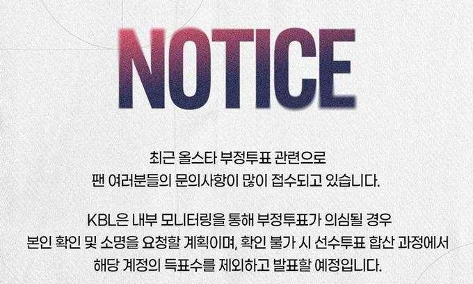 그러자 올해는 사회관계망서비스(SNS)인 텔레그램을 통해 KBL 홈페이지 아이디를 구매하는 방식으로 이뤄졌다는 의혹이 제기됐다. KBL 역시 이를 감지하고 지난 12일 “부정투표 관련으로 팬 여러분들의 문의사항이 많이 접수되고 있다”며 “올스타 팬 투표의 취지를 살리고 건전한 투표문화가 조성될 수 있도록 팬 여러분들의 많은 협조 부탁드린다”고 당부했다.