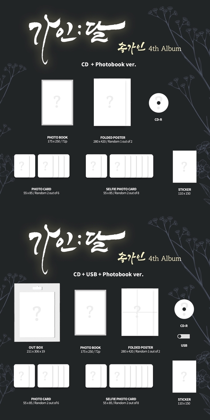정규 4집 ‘가인;달’ CD+Photobook 버전은 포토북과 포스터, 포토카드, 스티커, 셀피 포토카드가 담겨 구매 욕구를 높인다. 여기에 CD+USB+Photobook 버전에는 박스패키지와 USB가 추가로 구성돼 소장 가치를 더했다.