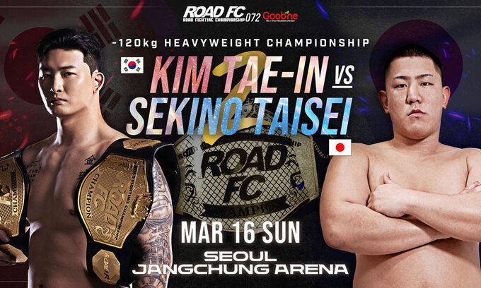 로드FC는 오는 3월16일 서울 장충체육관에서 ‘굽네 ROAD FC 072’를 개최한다. 이날 메인 이벤트로 김태인과 타이세이의 헤비급 타이틀전이 진행된다.