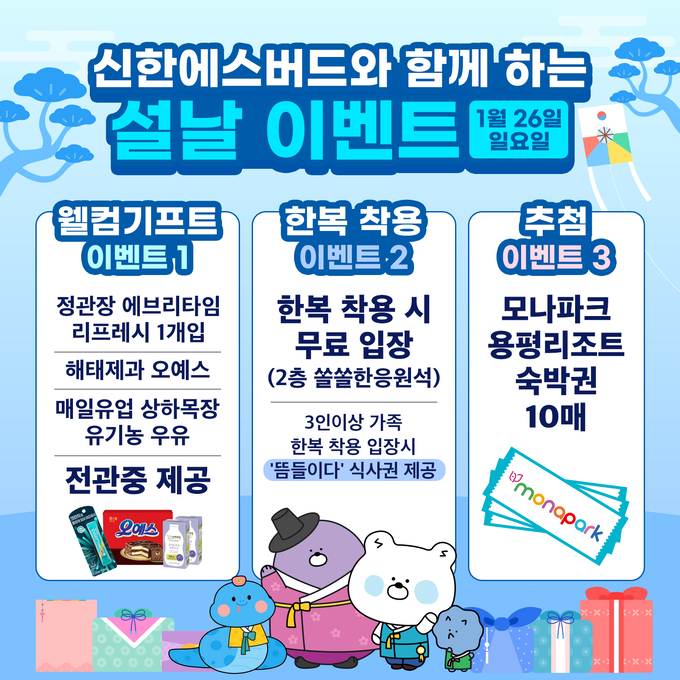 경기 종료 후에는 추첨권 이벤트를 통해서 ‘모나파크 용평리조트 숙박권’ 제공 등 풍성한 이벤트를 진행 예정이다. 신한은행은 “29일 경기에도 전 관중에게 ‘웰컴 기프트’ 제공 및 ‘한복 착용 관중 무료입장’ 이벤트를 진행하고, 경기전 관중들이 민속놀이 체험 존을 방문하여 오징어 게임 3종 (딱지치기, 공기놀이, 제기차기)을 체험 하고 목표 달성시 선물을 증정한다”고 설명했다.