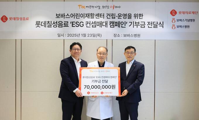 롯데칠성음료가 어린이 건강 증진 및 의료 지원 활동을 위한 ESG 매대 운영 수익금 7000만 원을 롯데의료재단에 기부했다.