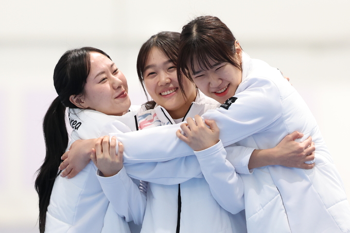 뜨겁게 서로를 끌어안았다. 한국 여자 스피드스케이팅 대표팀이 동메달로 유종의 미를 거뒀다.