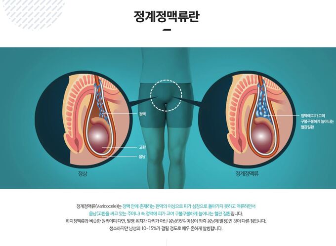 A. 정계정맥류는 고환 주변 정맥혈관이 비정상적으로 확장되고 꼬이는 질환이다. 하지정맥류와 비슷한 원리로 발생하며, 혈액이 원활하게 순환되지 못해 고여 있으면서 온도가 상승하고 고환 기능이 저하될 수 있다. 일반 남성의 10~15%에서 발견되며, 남성 난임 환자의 경우 21~41%까지 유병률이 높아진다.
