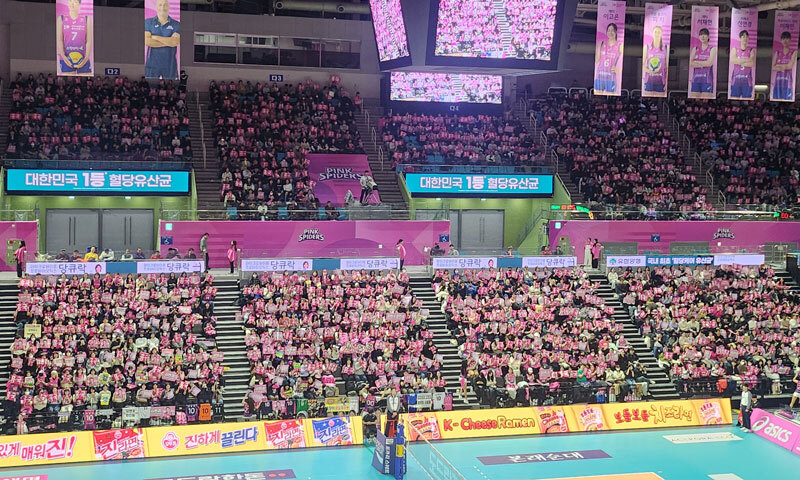 평일임에도 흥국생명의 홈 경기장인 인천 삼산월드체육관이 핑크색 물결로 가득 찼다.