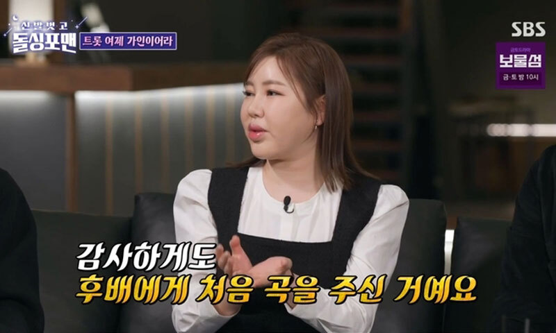 이날 방송에서 송가인은 신곡 ‘눈물이 난다’를 언급하며 심수봉에게 선물받은 곡이라고 전했다. 송가인은 “감사하게도 후배에게 처음 곡을 주신 거다”라며 작곡료도 받지 않았다고 덧붙이며 놀라움을 자아냈다.