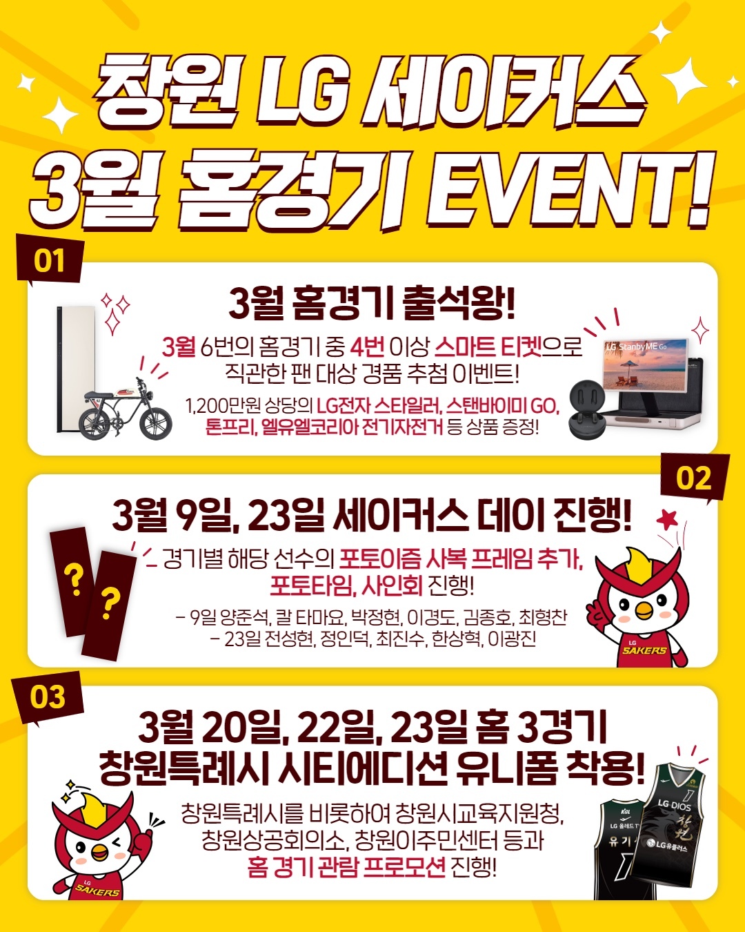프로농구 LG는 3월 홈 경기에서 출석왕 포함, 다양한 이벤트를 진행한다.