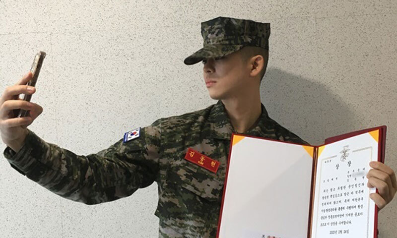 사진 속에서 그리는 해병대 군복을 입고 표창을 들고 포즈를 취하는 모습이 담겨 있다. 한층 늠름해진 그의 모습은 많은 이들의 이목을 끌었다.