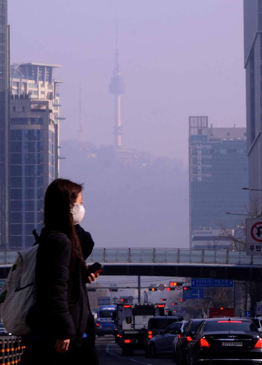 초미세먼지 농도가 '나쁨' 수준을 보인 10일 오전 서울 용산구 한강변에서 시민들이 이동을 하고 있다.