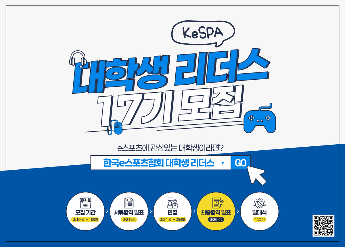 한국e스포츠협회(KeSPA)는 오는 16일까지 ‘KeSPA 대학생 리더스’ 17기를 모집한다고 10일 밝혔다.