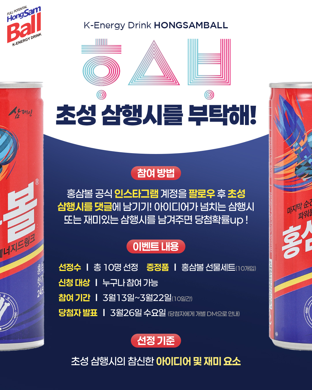 이번 이벤트를 통해 선정된 10명의 참가자에게는 K-에너지드링크 홍삼볼 선물세트(10개입)가 증정된다. 당첨자는 오는 3월 26일 개별 DM을 통해 발표될 예정이다. 선정 기준은 초성 삼행시의 창의성과 재미 요소가 중요한 평가 요소로 작용한다.