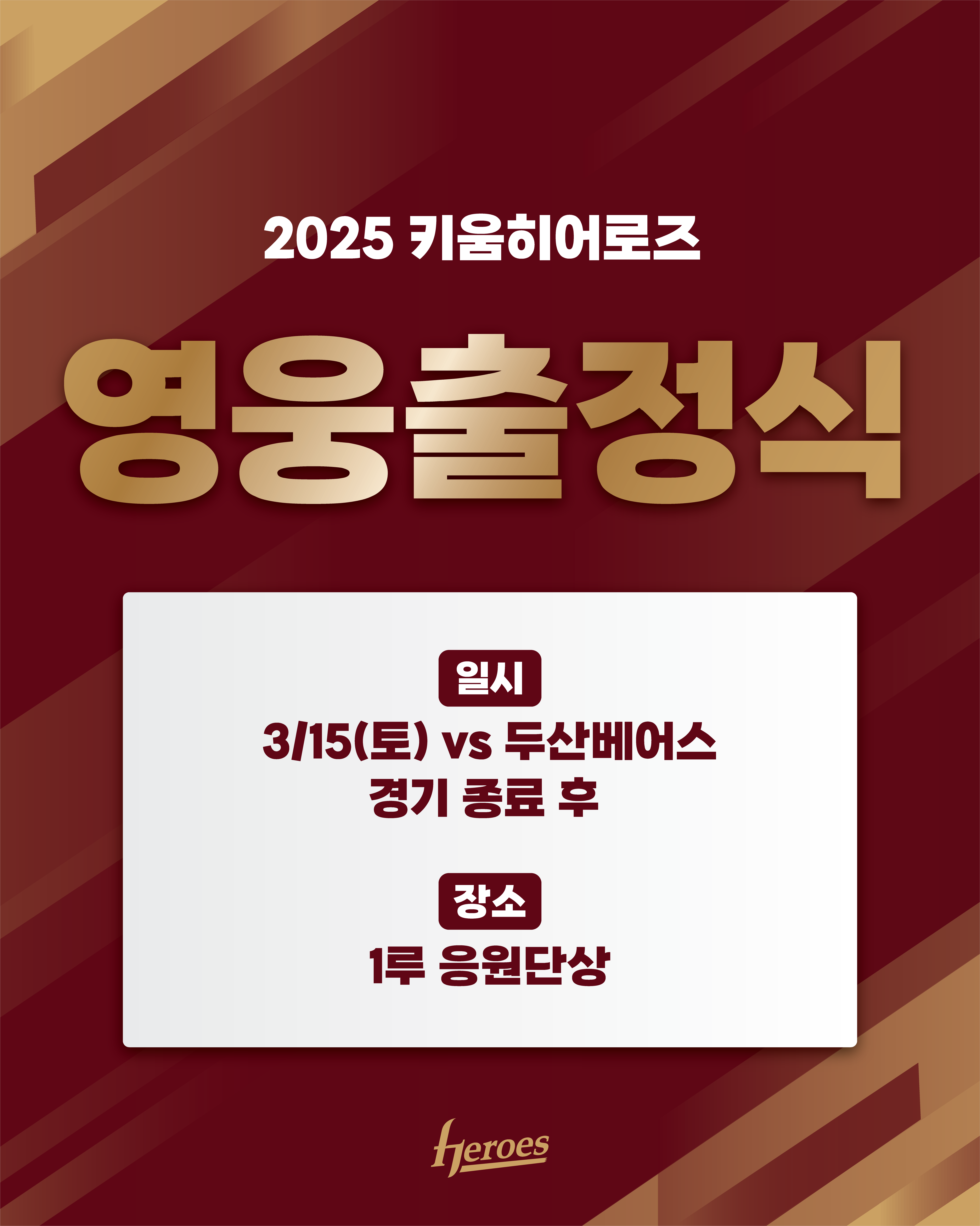 프로야구 키움은 15일 서울 고척스카이돔에서 열리는 두산베어스와 시범경기 종료 후 1루 응원단상에서 2025시즌 ‘영웅출정식’을 개최한다.