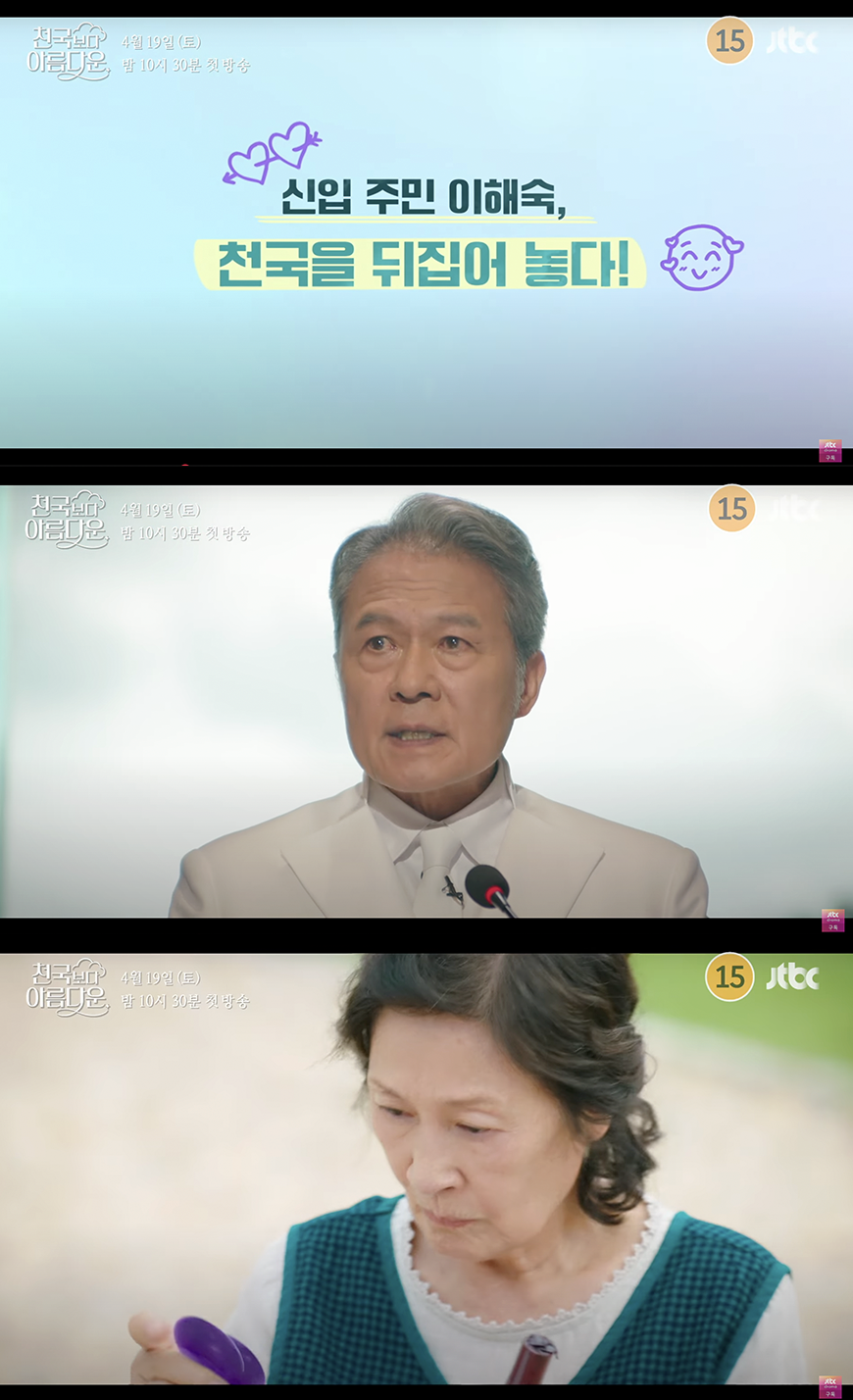 이번 3차 티저 영상에서는 ‘신입 주민 이해숙, 천국을 뒤집어 놓다’라는 문구와 함께, 센터장(천호진 분)에게 요주의 인물로 제대로 찍힌 이해숙의 천국 생활을 포착해 눈길을 끈다. 이해숙은 회개를 위해 찾은 교회에서 목사(류덕환 분)에게 삐딱한 자세를 가르치고, 모든 기억을 잃은 순수한 영혼 솜이(한지민 분)가 이해숙의 영향을 받아 변해가는 모습을 보여준다.“천국이 예전보다 재미있어진 것 같죠? 꽤 많은 변화들이 이해숙 님으로부터 시작된 것 같은데”라고 센터장이 다정하지만 의미심장한 말을 던지면서, 이해숙은 자신이 천국에 잘못 온 것은 아닌지 스스로에게 의심을 품기도 한다.