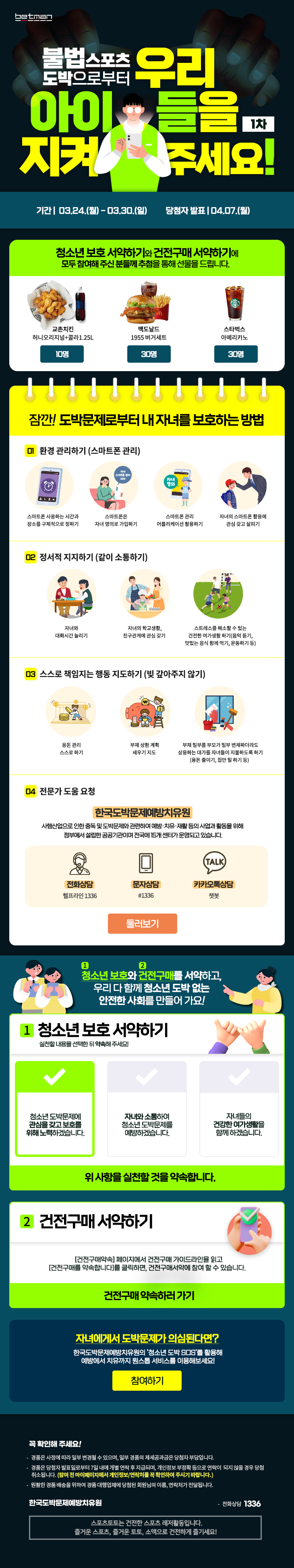 ‘청소년 도박 예방 캠페인’은 베트맨 홈페이지에서 청소년 보호 서약을 하는 방식으로 진행될 예정이다. 서약에 참여한 베트맨 이용자는 자동으로 경품 추첨 대상자로 등록되며, 추첨을 통해 ▲교촌치킨 허니오리지널 및 콜라세트(10명) ▲맥도날드 1955 버거 세트(30명) ▲스타벅스 아메리카노(30명) 등 다양한 경품이 제공된다. 경품 당첨자는 다음 달 7일에 발표된다.