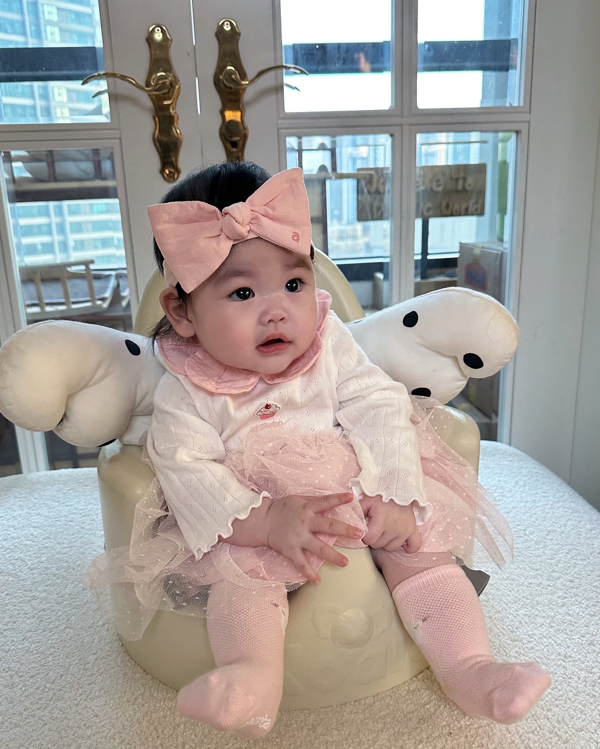 사진 속에는 박수홍 부부의 딸 재이가 150일을 맞아 기념 사진을 찍으며 인증샷을 남긴 모습이 담겨 있다. 특히 재이의 똘망한 눈빛이 박수홍을 닮아 더욱 눈길을 끈다. 다른 사진에서는 재이와 반려묘 다홍이가 같은 옷을 입고 찍은 모습도 볼 수 있다.