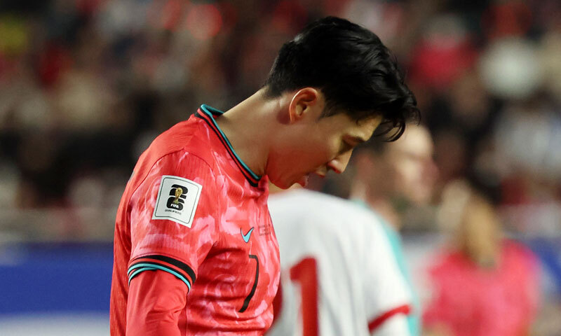 고개를 숙인다. 홍명보 감독이 이끄는 한국 축구대표팀은 25일 수원월드컵경기장에서 2026 국제축구연맹(FIFA) 북중미 월드컵 아시아 3차 예선 B조 요르단과의 8차전에서 1-1로 비겼다. 한국은 승점 16(4승4무)으로 B조 선두를 유지했으나, 2위 요르단(승점 3)에 승점 3점 차로 쫓기게 됐다.