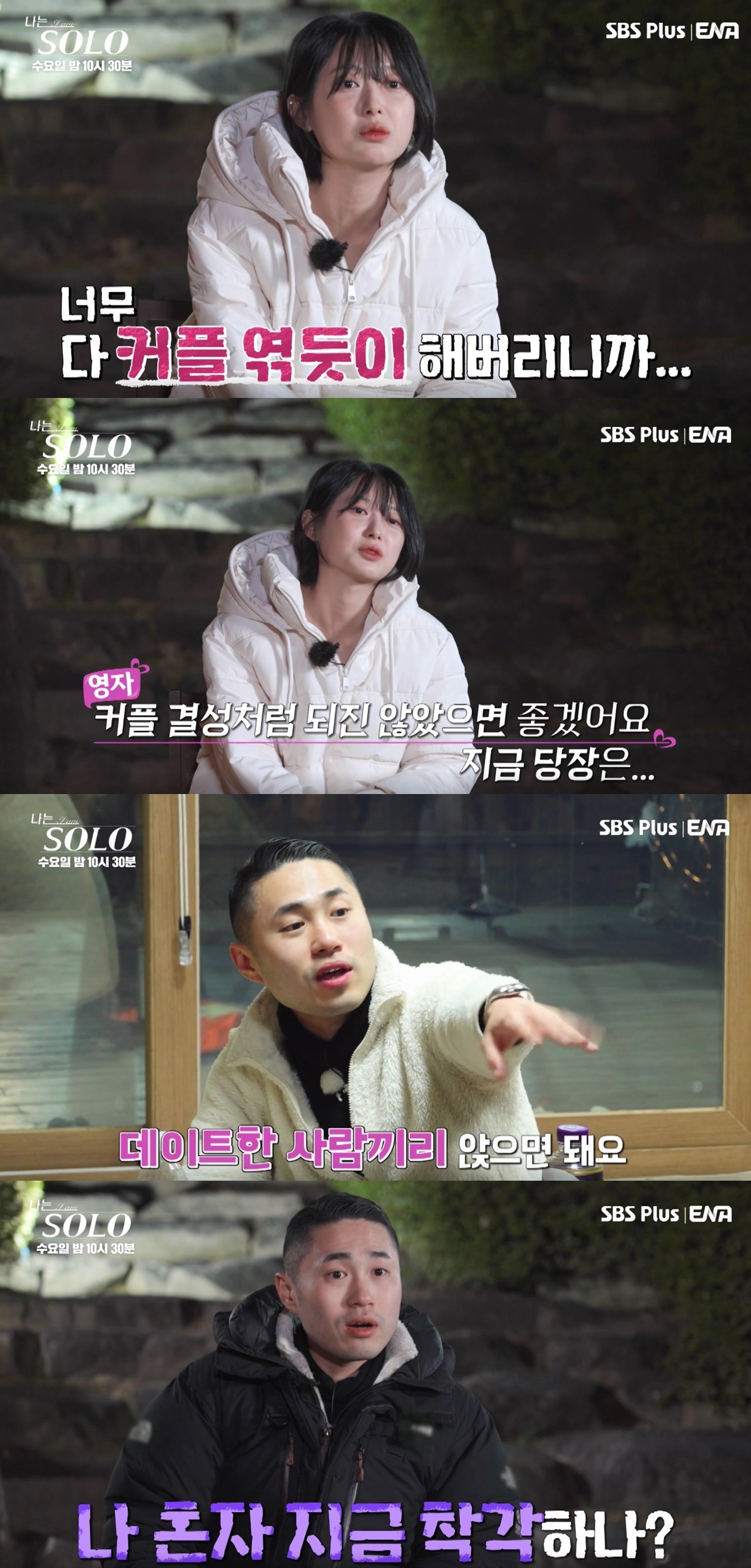 영수는 “데이트한 사람들끼리 앉으면 된다”며 영자의 옆자리를 사수하려고 했고, 영자는 “데이트한 사람끼리 앉으라고 하지 마라”고 결국 짜증을 냈다.