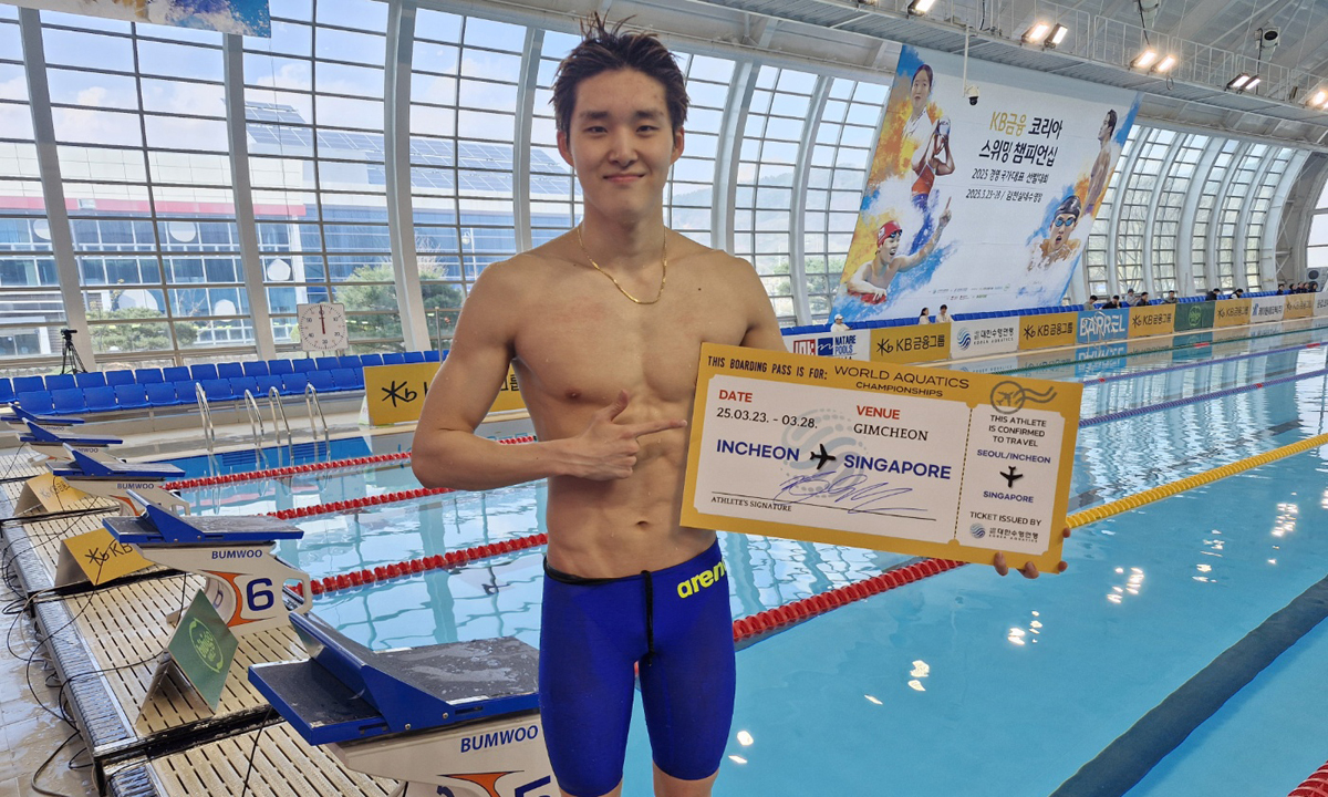 한국 수영의 중·장거리 간판 김우민(강원특별자치도청)이 또 한 번 세계수영선수권대회 출전권을 거머쥐었다. 28일 김천실내수영장에서 열린 KB금융 코리아 스위밍 챔피언십 2025 경영 국가대표 남자 자유형 400m 결승에서 3분45초54를 기록, 출전 선수 가운데 가장 먼저 터치패드를 찍었다. 에이스다운 면모를 유감없이 발휘했을 뿐 아니라, 국제연맹 기준 기록(3분 48초 15)을 넘기며 자력으로 세계수영선수권대회 출전권을 획득했다.