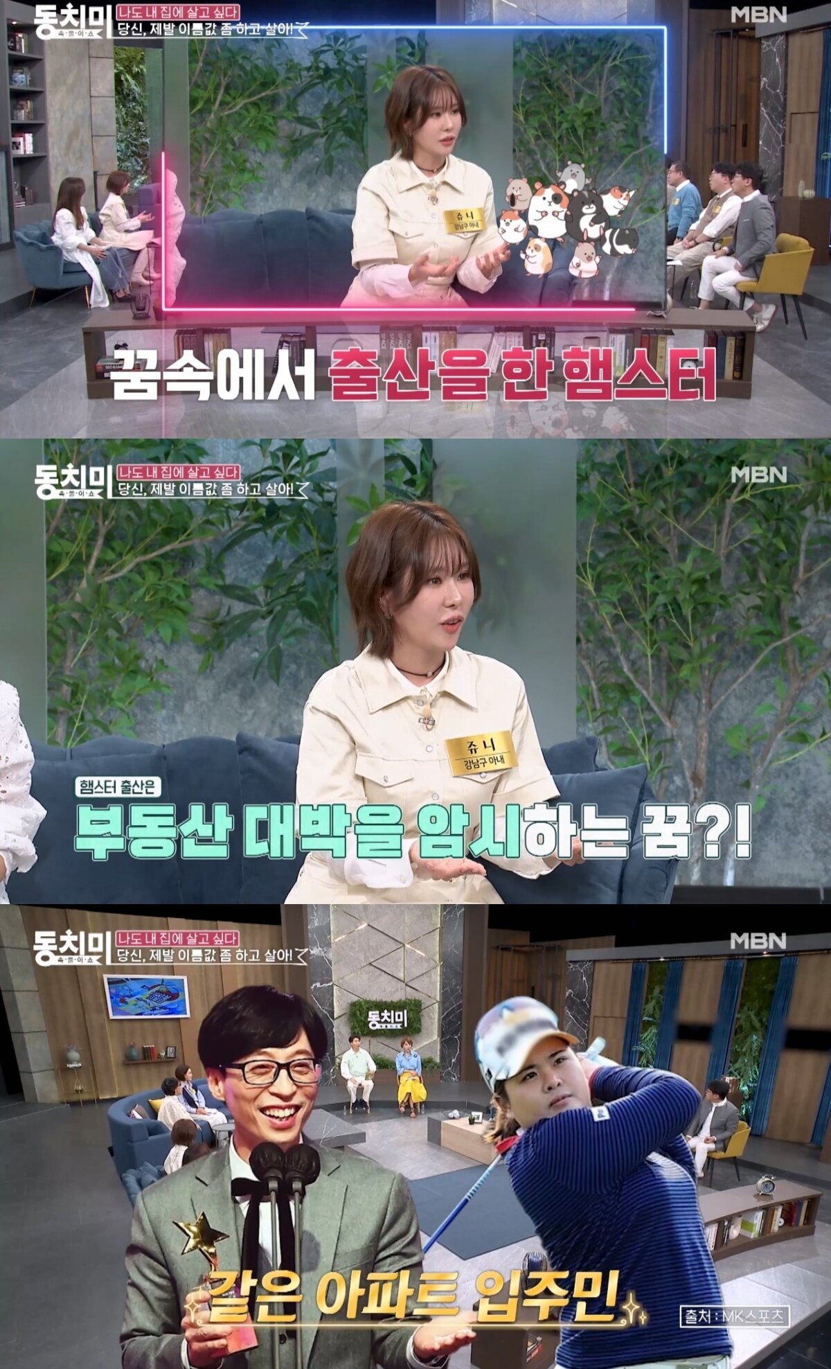 또 쥬니는 ‘부동산 대박’을 암시하는 듯한 햄스터 7마리를 출산하는 꿈을 꾸었다고 언급했다. 그날이 지금 사는 집을 보러 가기로 약속한 날이었고 남편에게 계약을 추천했다는 것. 강남구는 “유재석씨가 사는 동에 딱 자리가 났었고, 아내가 ‘그래도 안 사?’라고 해 큰 결심을 하게 됐다”는 비화를 전했다.