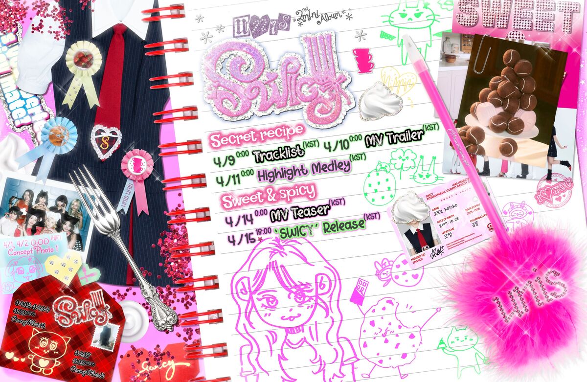 공개된 스케줄러 속에는 핑크색 레시피북 위로 'SWICY'의 프로모션 일정이 빼곡하게 펼쳐져 있다. 이와 함께 유니스의 영한 에너지와 키치한 무드를 극대화하듯 교복, 학생증, 쿠키, 포크 등으로 아기자기하게 꾸며진 디자인이 눈길을 끈다.