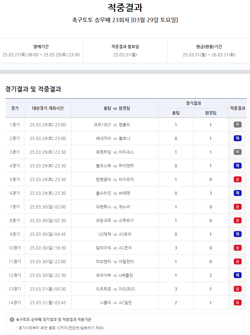 국민체육진흥공단이 발행하는 체육진흥투표권 스포츠토토의 수탁사업자 ㈜스포츠토토코리아는 지난 29일부터 31일까지 진행된 세리에A, 분데스리가 등 유럽 주요리그 14경기를 대상으로 한 축구토토 승무패 23회차 게임의 적중 결과를 31일 발표했다.