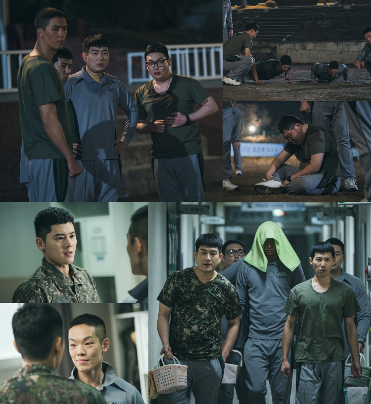 이날 공개된 사진에는 희비 엇갈린 1, 3생활관의 신병 맞이로 호기심을 자극한다. 먼저 연병장 구보를 마친 1, 3생활관의 극과 극 분위기가 흥미롭다. 땀범벅으로 실신 직전의 1생활관 신병 문빛나리(김요한 분)는 박민석의 ‘폐급’ 시절을 떠올리게 하며 쉽지 않은 군생활을 짐작케 한다. 당황스러운 기색이 역력한 최일구(남태우 분), 박민석, 임다혜(전승훈 분)의 모습도 포착됐다. 이들의 시선 끝에는 구보를 마친 3생활관 신병 전세계(김동준 분)와 강찬석(이정현 분)이 1생활관 보란듯이 푸시업 세리머니(?)를 하고 있다. 시작부터 기세가 제대로 꺾인 1생활관은 자존심을 회복할 기회를 노린다고. 비장하게 샤워실로 향하는 1생활관 박민석, 최일구, 임다혜, 김상훈의 모습이 흥미진진하다.
