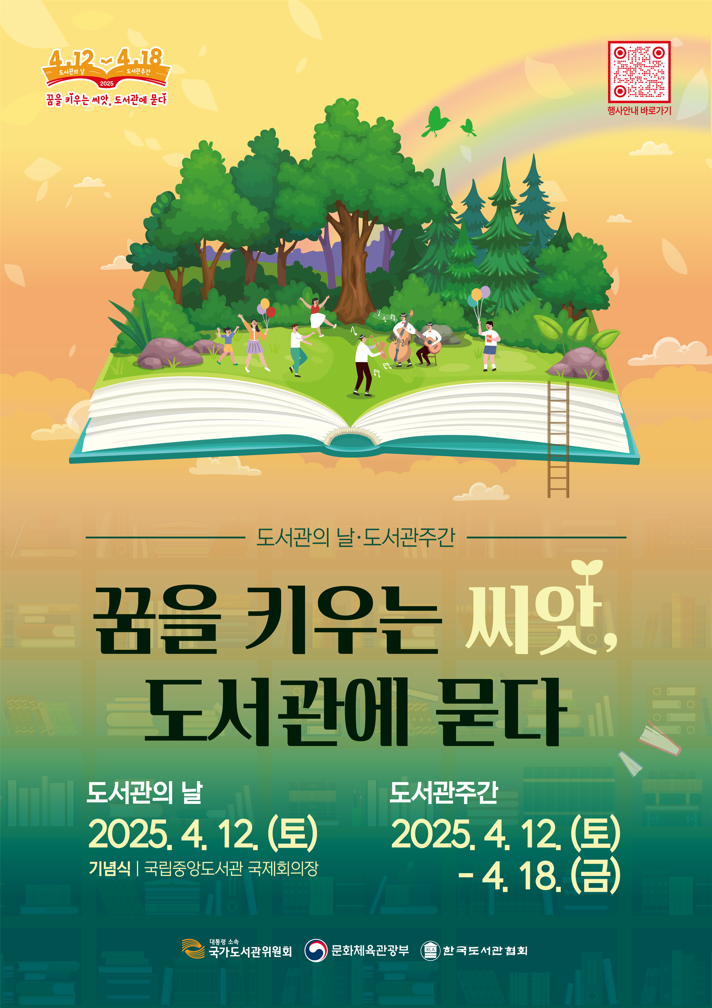 문화체육관광부는 국가도서관위원회와 함께 오는 12일 오전 11시 국립중앙도서관에서 ‘꿈을 키우는 씨앗, 도서관에 묻다’를 주제로 제3회 도서관의 날 기념식을 연다.