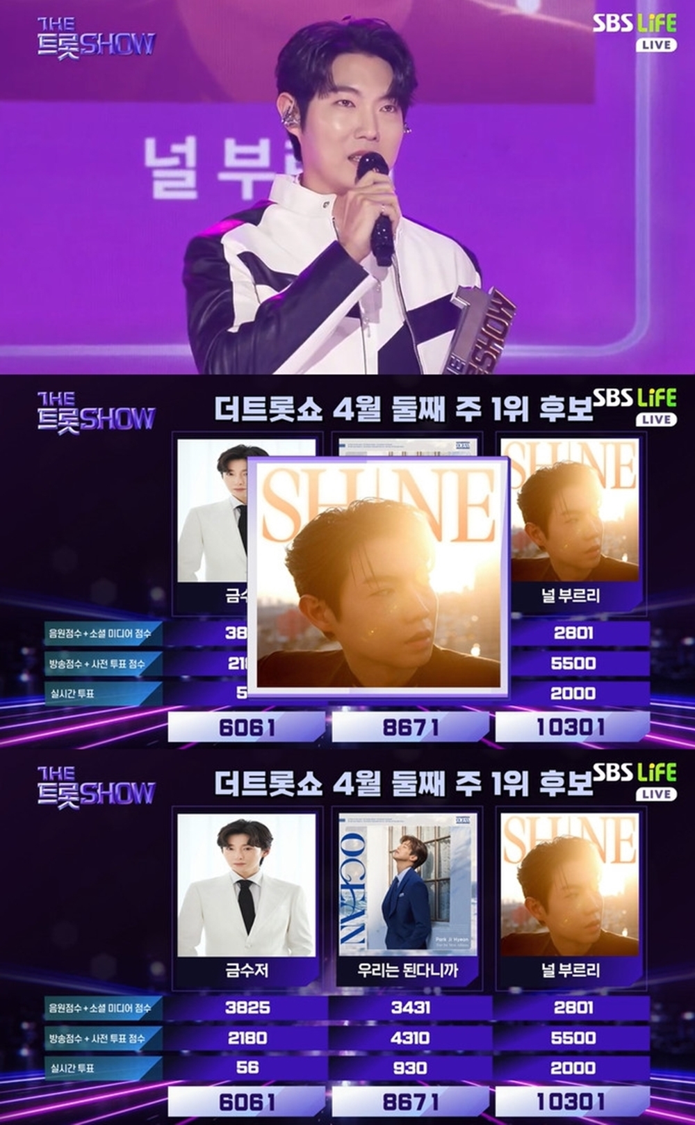 지난 14일 밤 8시 방송된 SBS Life ‘더 트롯쇼’에서는 손태진 ‘널 부르리’, 박지현 ‘우리는 된다니까’, 김용빈 ‘금수저’가 4월 둘째 주 1위 후보에 올랐다. 이 중 손태진은 총 10301점을 받으며 ‘널 부르리’로 1위를 차지했다.