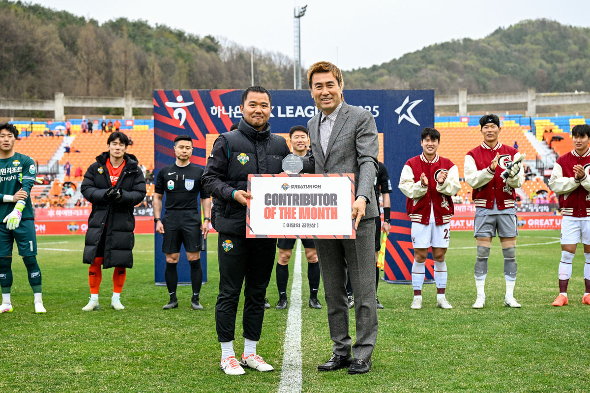 강원FC는 지난 13일 춘천송암스포츠타운 주경기장에서 열린 하나은행 K리그1 2025 8라운드 광주FC와 홈경기에서 3월의 공헌상 시상식을 진행했다. 지난해 신설된 이달의 공헌상은 묵묵히 구단 발전에 공헌한 ‘언성 히어로’를 선수단과 프런트에서 1명씩 선정한다. 수상자에게는 트로피와 상품권을 선물한다.