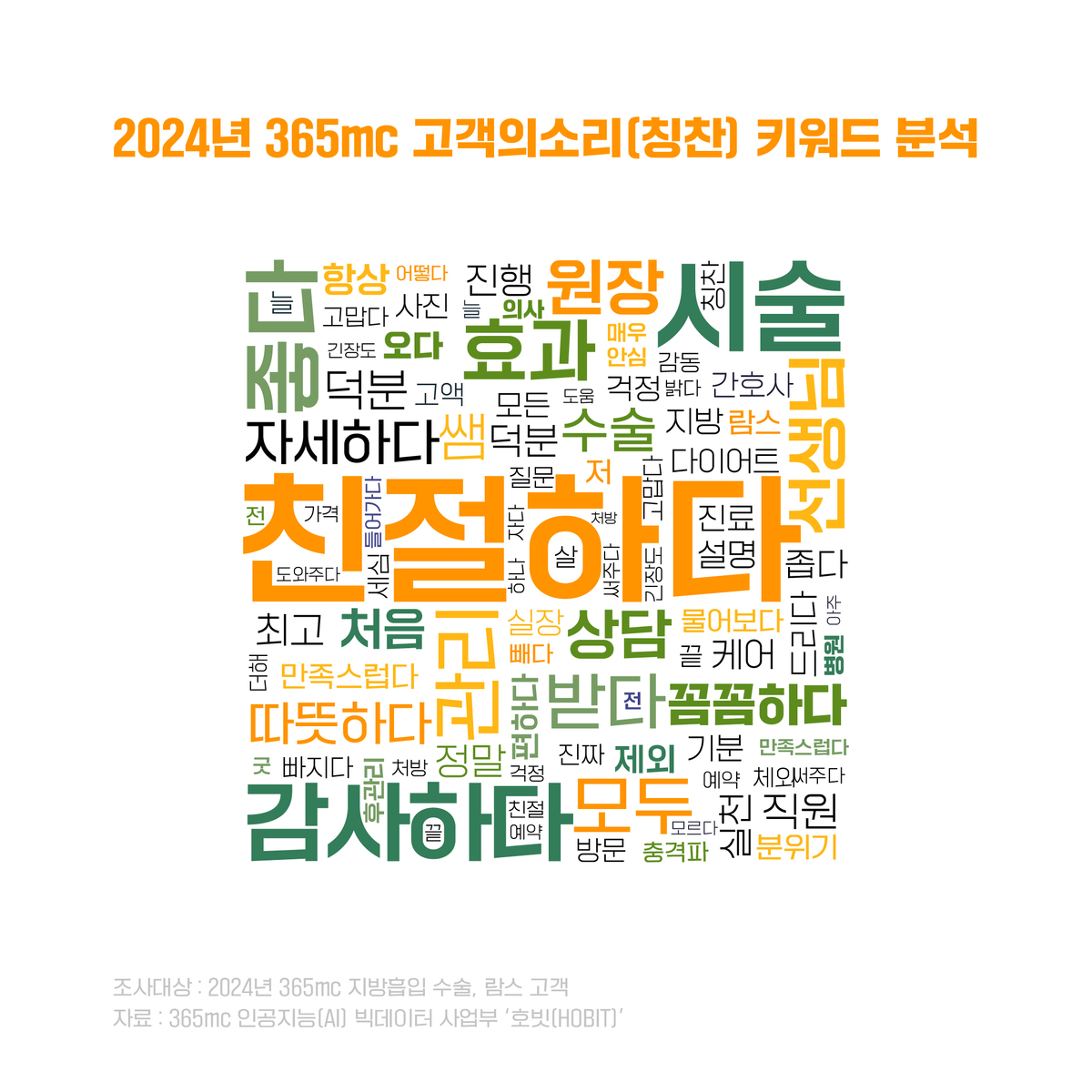지방흡입 특화병원 365mc의 AI 빅데이터 사업부 호빗(HOBIT)은 '고객의 소리(칭찬)'에서 나온 키워드를 2022~2024년 총 3년간 연도별, 높은 빈도 순으로 분류한 결과를 17일 발표했다.