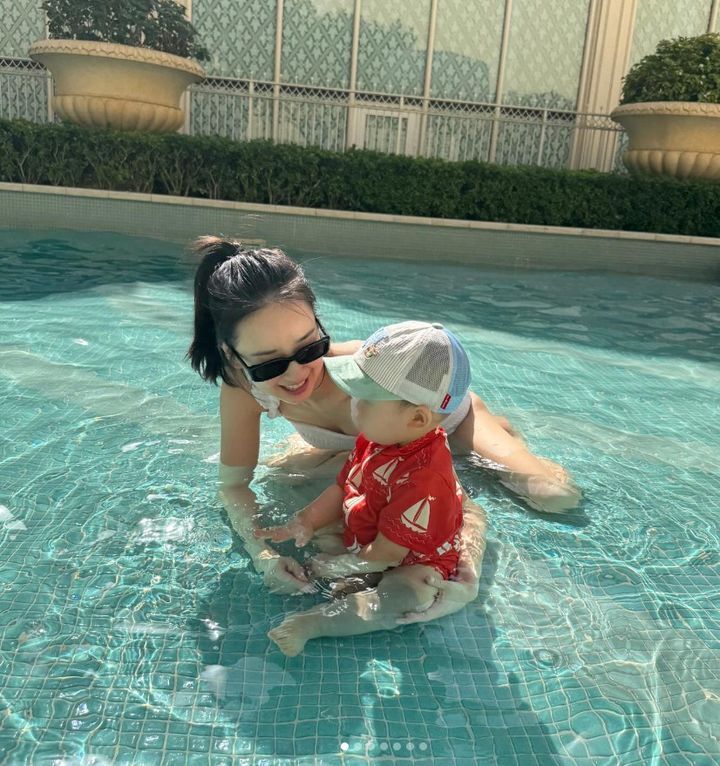 공개된 사진 속 손연재는 마카오에서 아들과 함께 수영장에서 물놀이를 즐기는 모습이 담겨있다. 캐주얼한 의상을 입고 군살 없는 몸매와 청순한 매력을 동시에 뽐내며 시선을 끌었다.